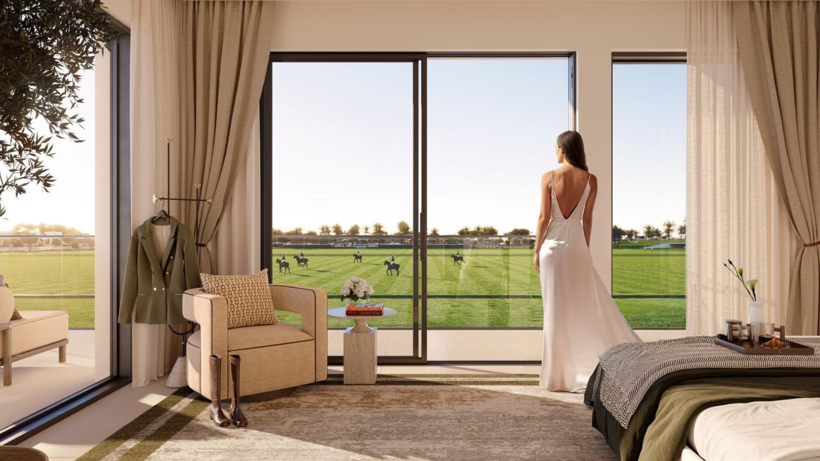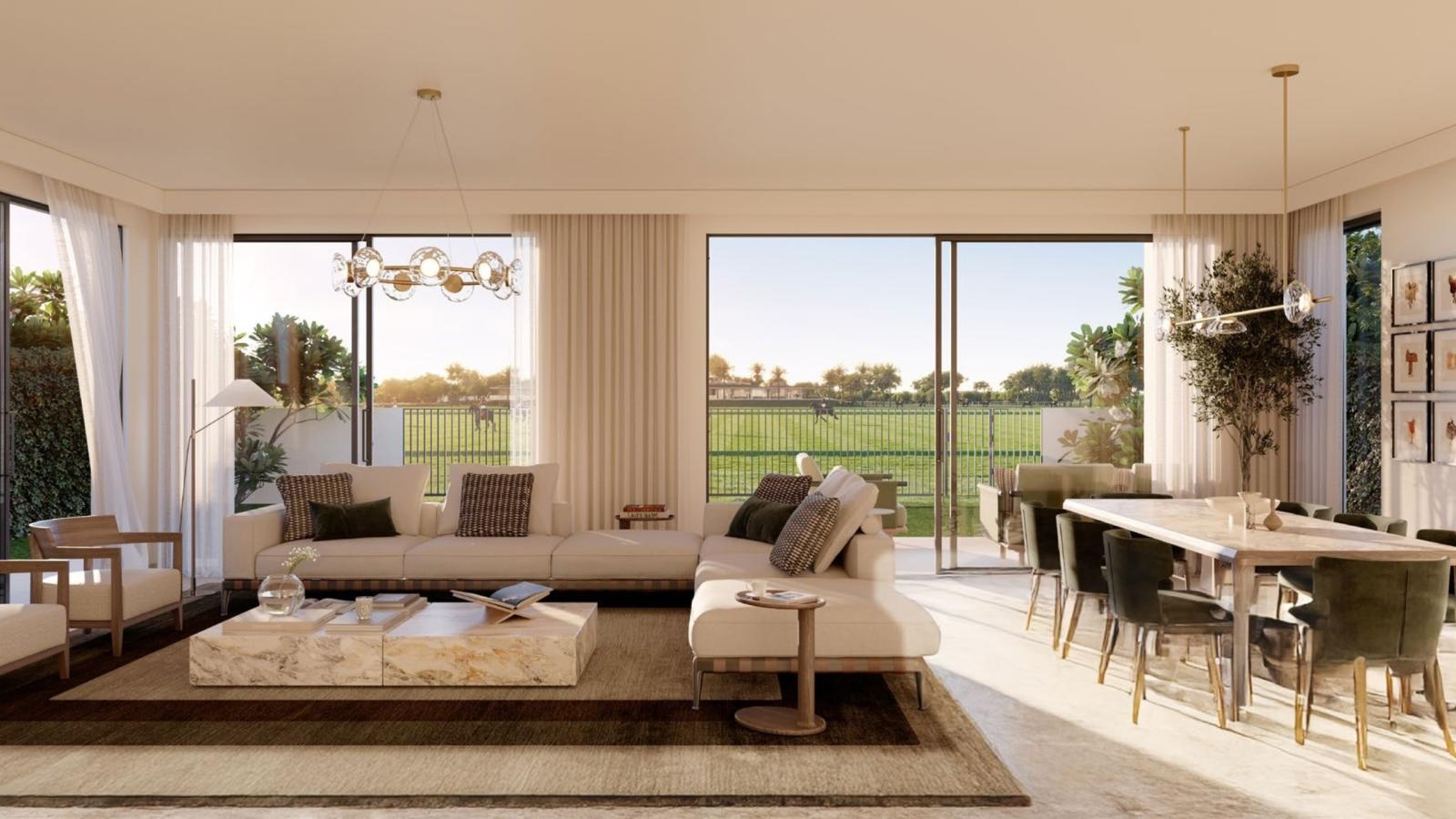 Inside every residence, interiors express calmness and understated luxury. Soft color palettes, textured materials, polished surfaces, and bespoke joinery create a sophisticated ambiance. Open-plan layouts ensure a smooth connection between living, dining, and outdoor areas, while large windows overlook lush pathways and landscaped surroundings. Whether enjoying peaceful mornings in the garden or evenings on a shaded terrace, residents are immersed in serenity inspired by Dubai’s blooming equestrian culture.