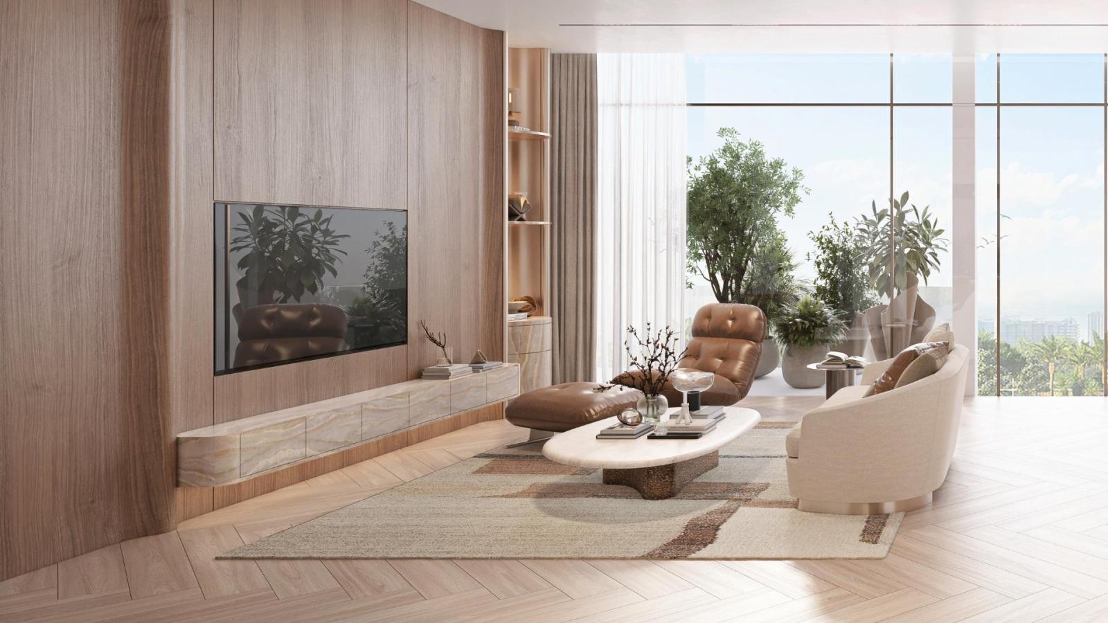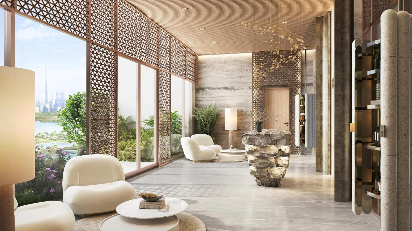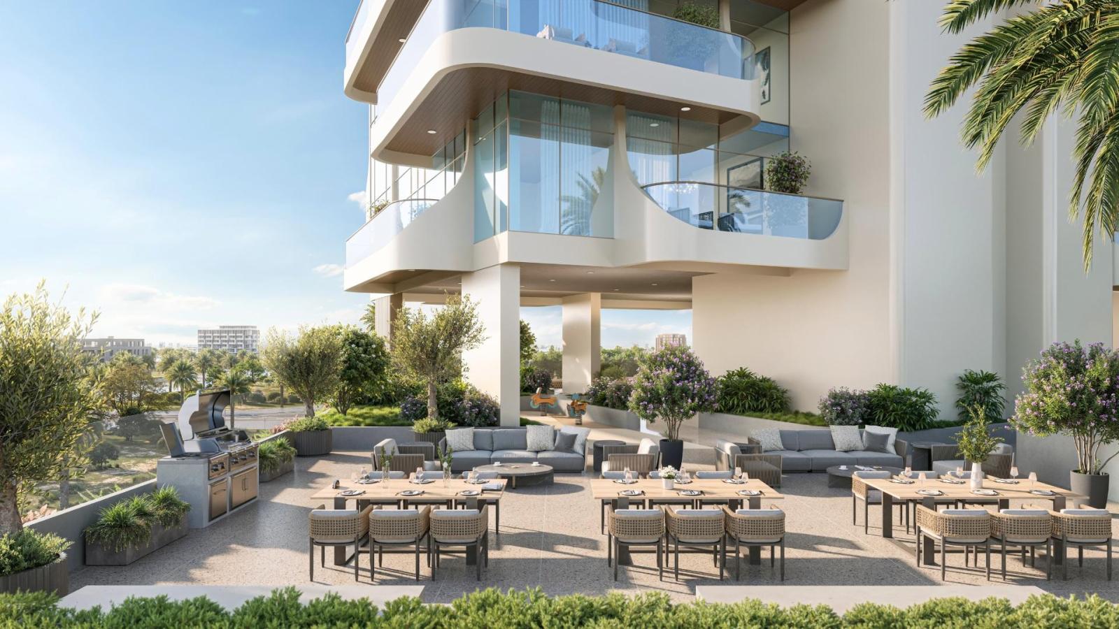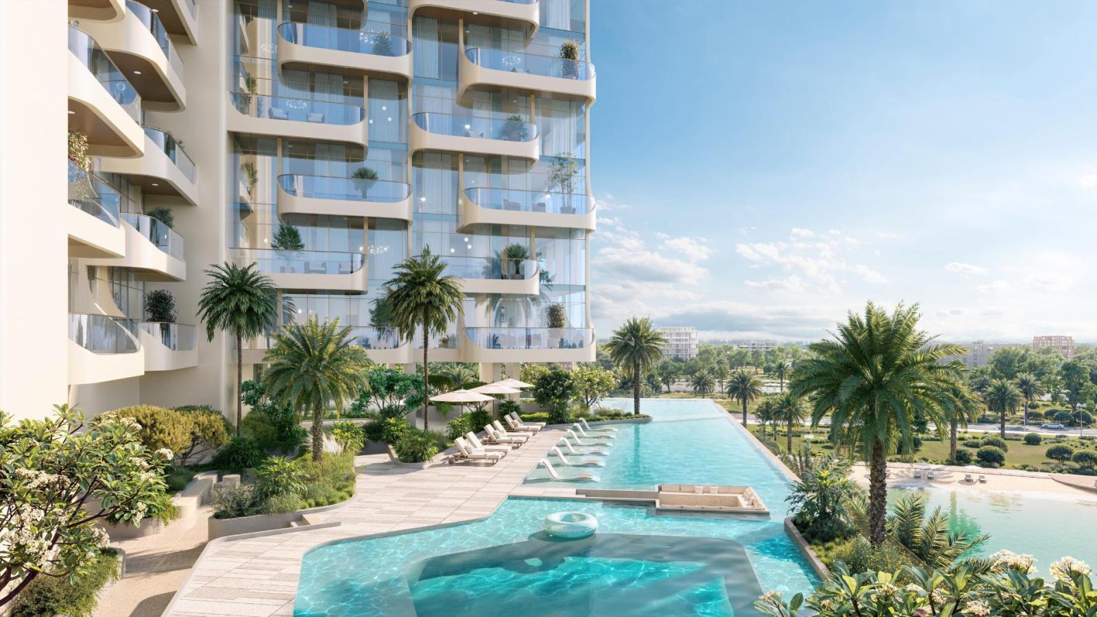 Architecturally, the tower rises with a straight vertical form, featuring two basement levels, a grand entrance with shaded drop-off zones, three podiums, 20 residential floors, and a finishing rooftop space. The façade is distinguished by floor-to-ceiling glass, irregular balconies, and striking frames that embrace panoramic views of the lagoon and surrounding greenery. A total of 221 spacious homes have been designed for functional living with elegant detailing, premium materials, and soft textures throughout the interiors. With LEED sustainability ambitions, WiredScore technology readiness, and WELL Standard wellness goals, the building sets a benchmark for future-forward living in Dubai’s urban landscape.