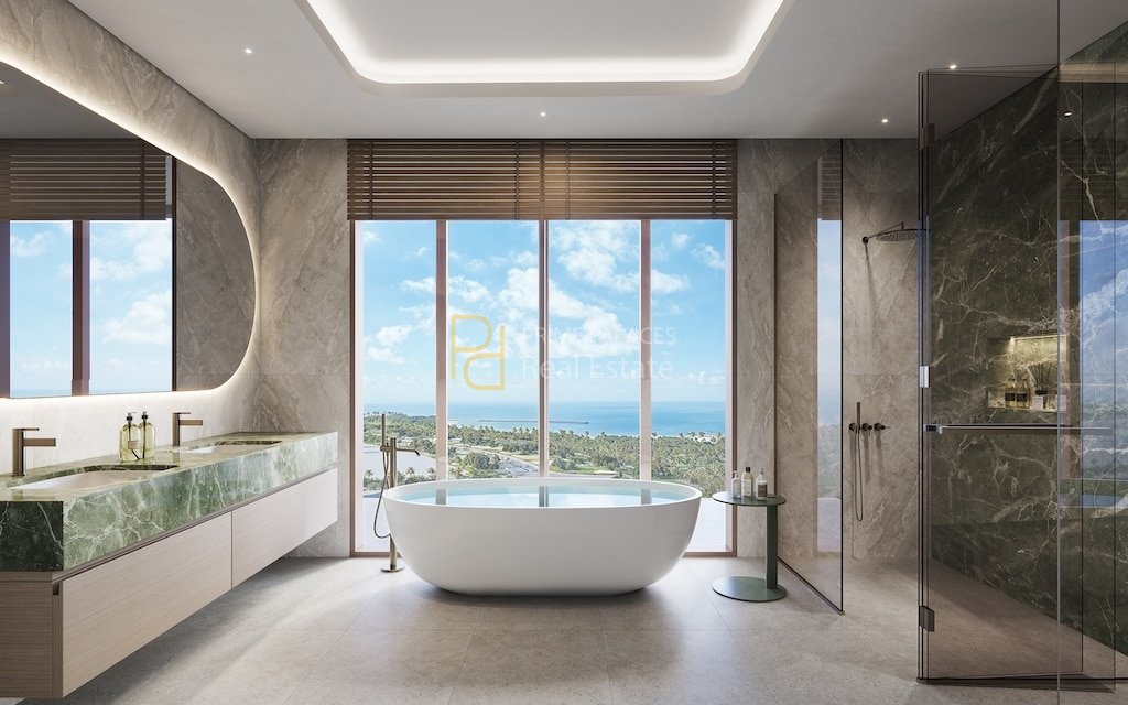 Inside each residence, Hado delivers a sense of understated luxury defined by refined materials, soft neutral palettes, and sculptural detailing. Living areas feature impressive 3.2-meter floor-to-ceiling heights, enhancing openness and spatial comfort, while large windows frame panoramic views of the cove and sea. Bedrooms are conceived as private retreats, combining privacy with visual connection to the waterfront. Kitchens showcase crafted timber cabinetry and metal accents inspired by Japanese minimalism, while bathrooms are designed as calming sanctuaries filled with natural light and textured finishes.