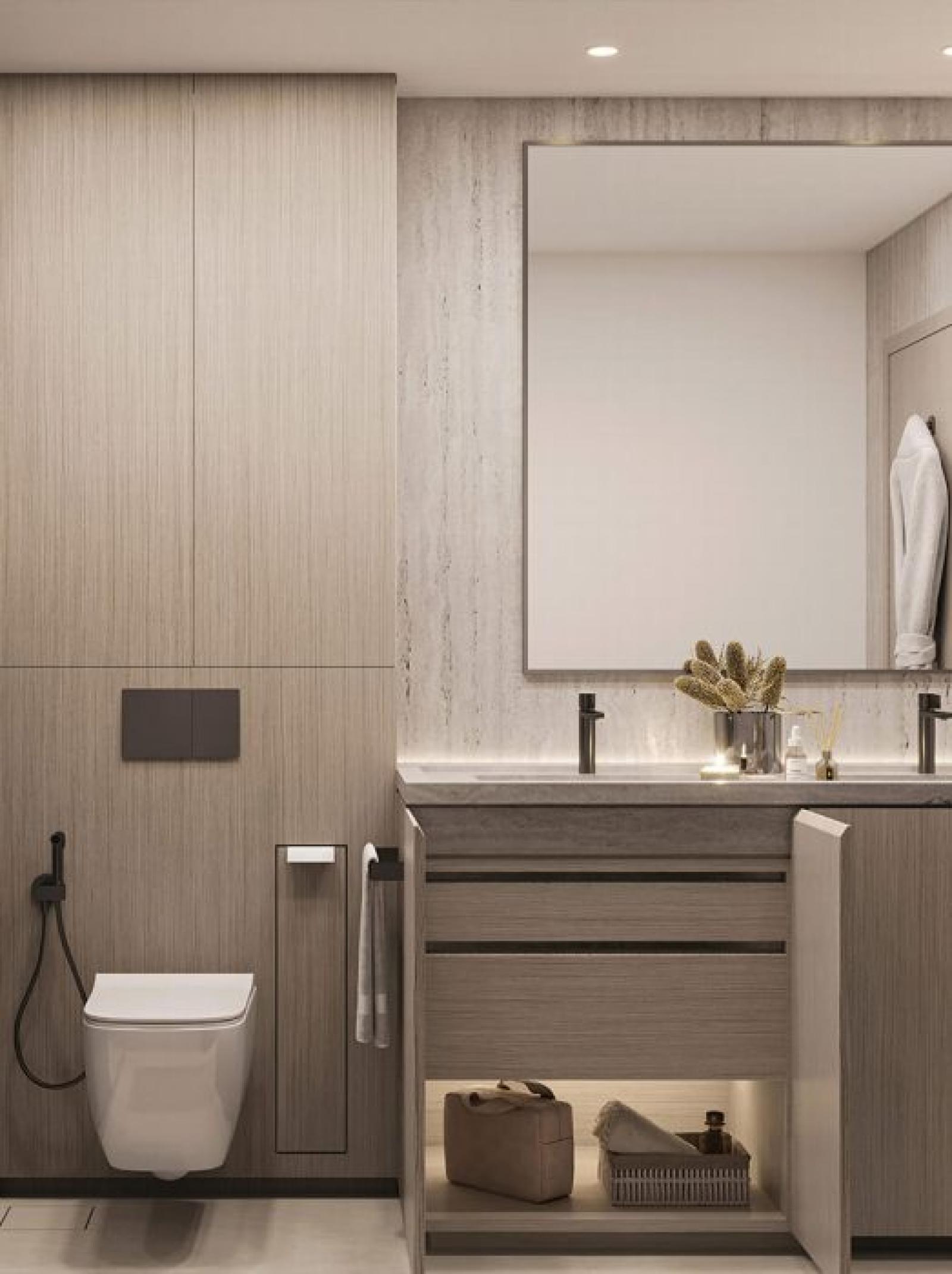 Inside, every home is a statement of understated luxury. The interiors feature premium materials, refined finishes, and neutral color palettes that invite natural light and frame serene views of the surrounding waterways. Floor-to-ceiling glazing connects each apartment with its natural surroundings, while carefully positioned screening elements ensure privacy without sacrificing openness.