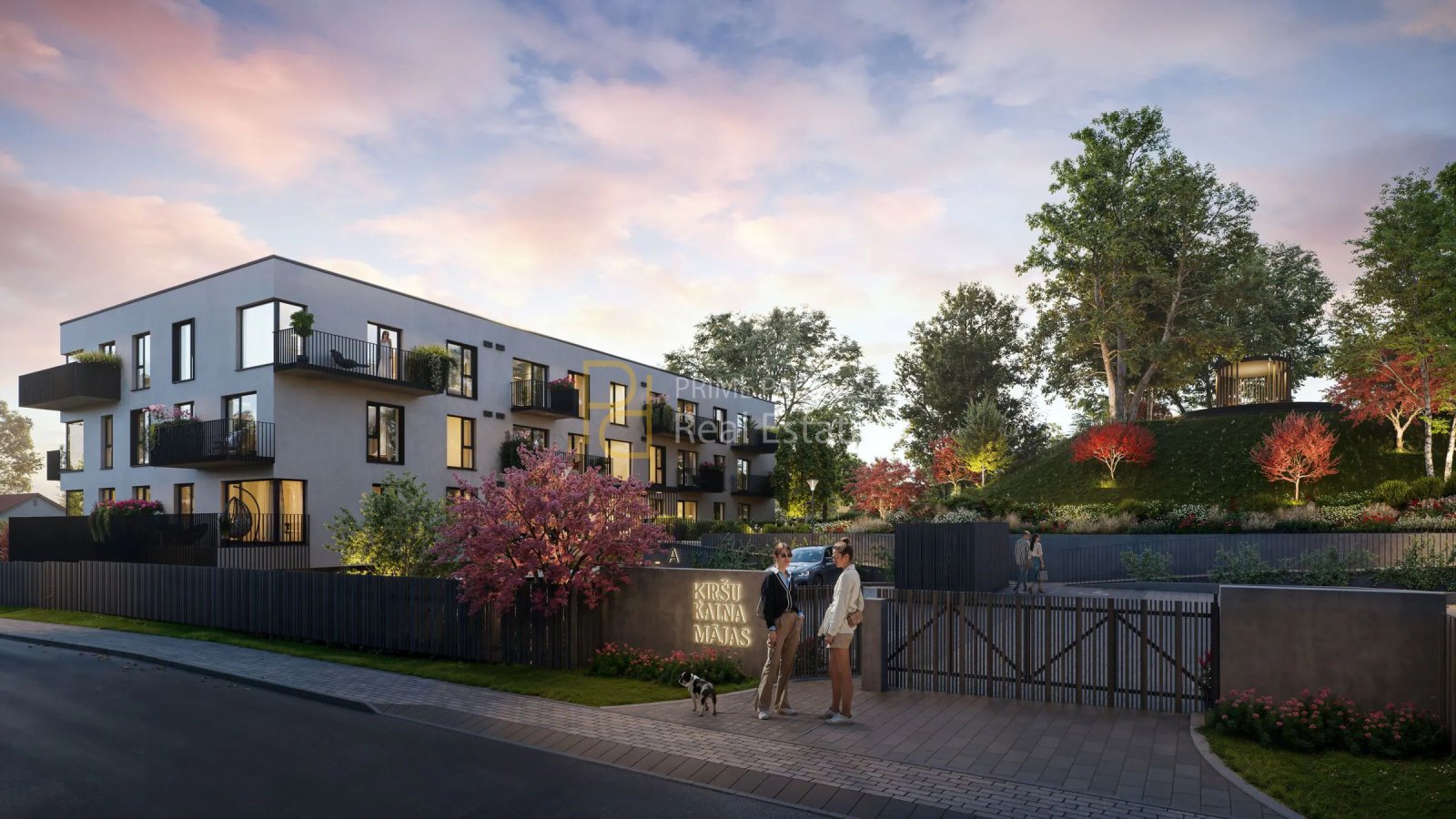 A defining feature of Ķiršu Kalna Mājas is its internal courtyard concept. The development incorporates an existing landscaped hill into the design, transforming it into a central green space with a dedicated relaxation area and meditation platform. This is combined with a closed and controlled territory, ensuring a secure environment for residents. The courtyard includes a children’s playground and pedestrian paths, creating a structured outdoor environment that supports daily use rather than purely aesthetic landscaping.